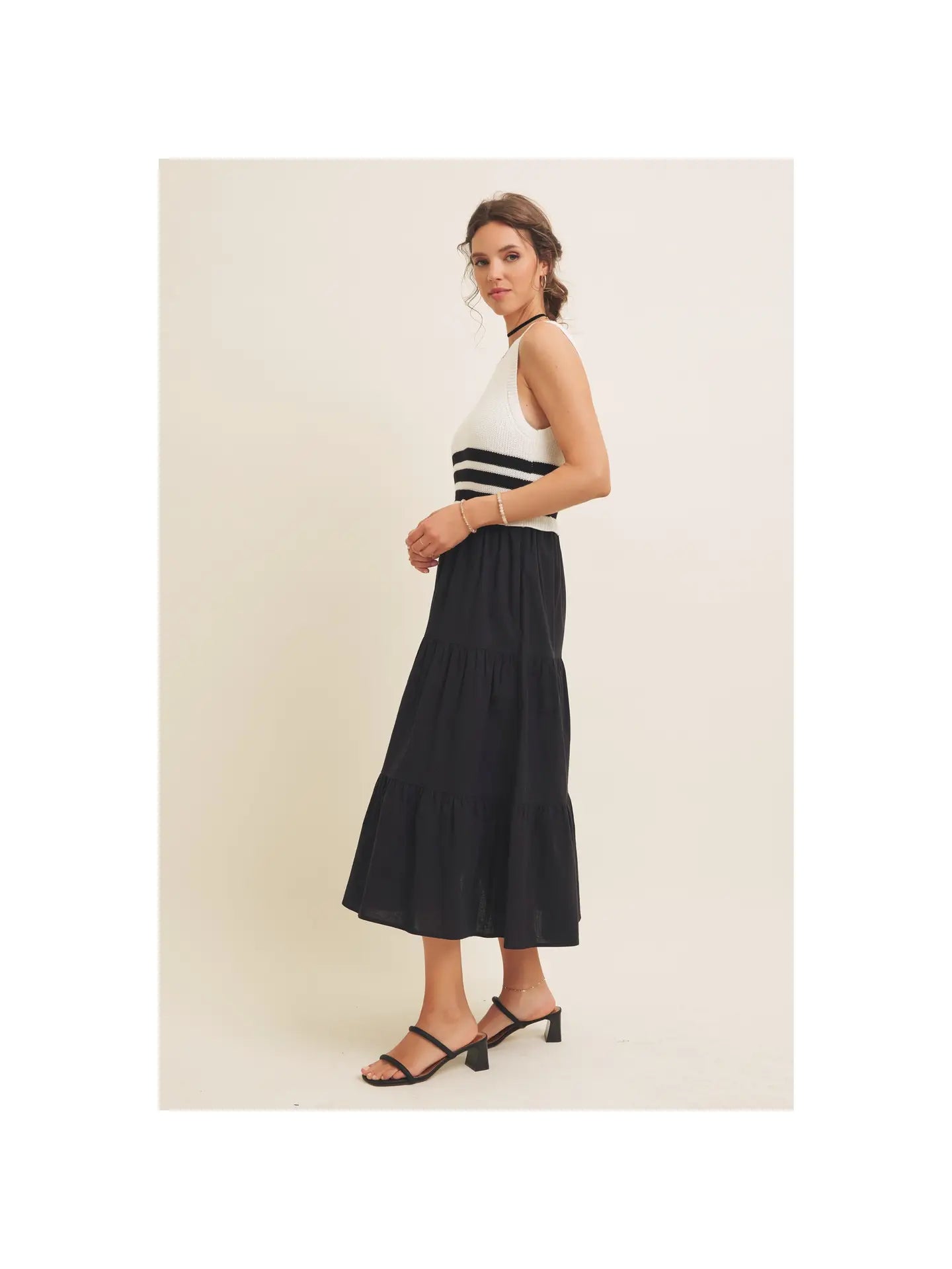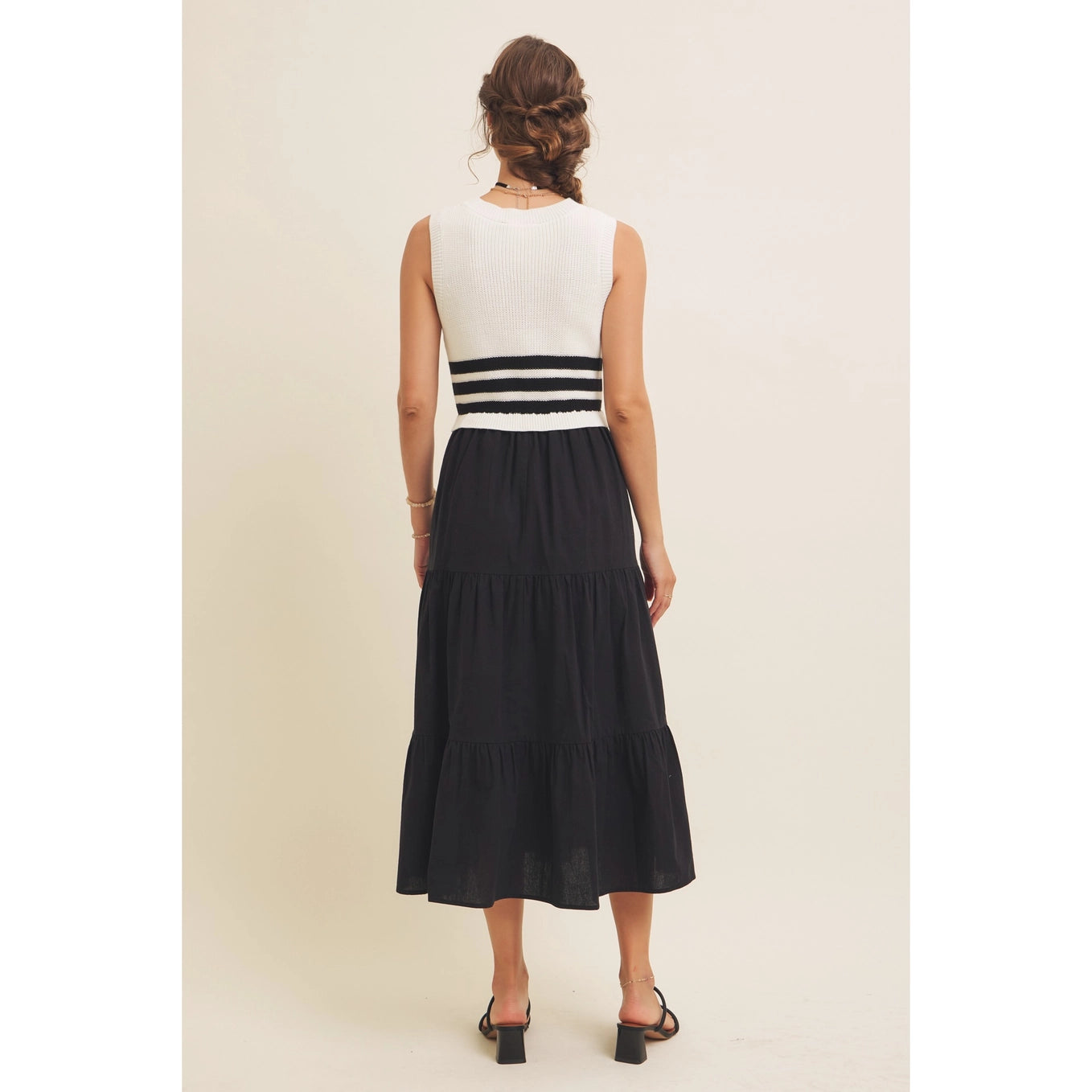 This Striped Sweater Top Dress combines the cozy comfort of a sleeveless sweater with the elegant flow of a midi-length skirt. Featuring a chic black stripe design, it offers versatile style that transitions effortlessly from casual days to polished evenings. Its flattering silhouette and breathable fabric make it a must-have for your wardrobe, delivering both comfort and sophistication in one effortless piece.