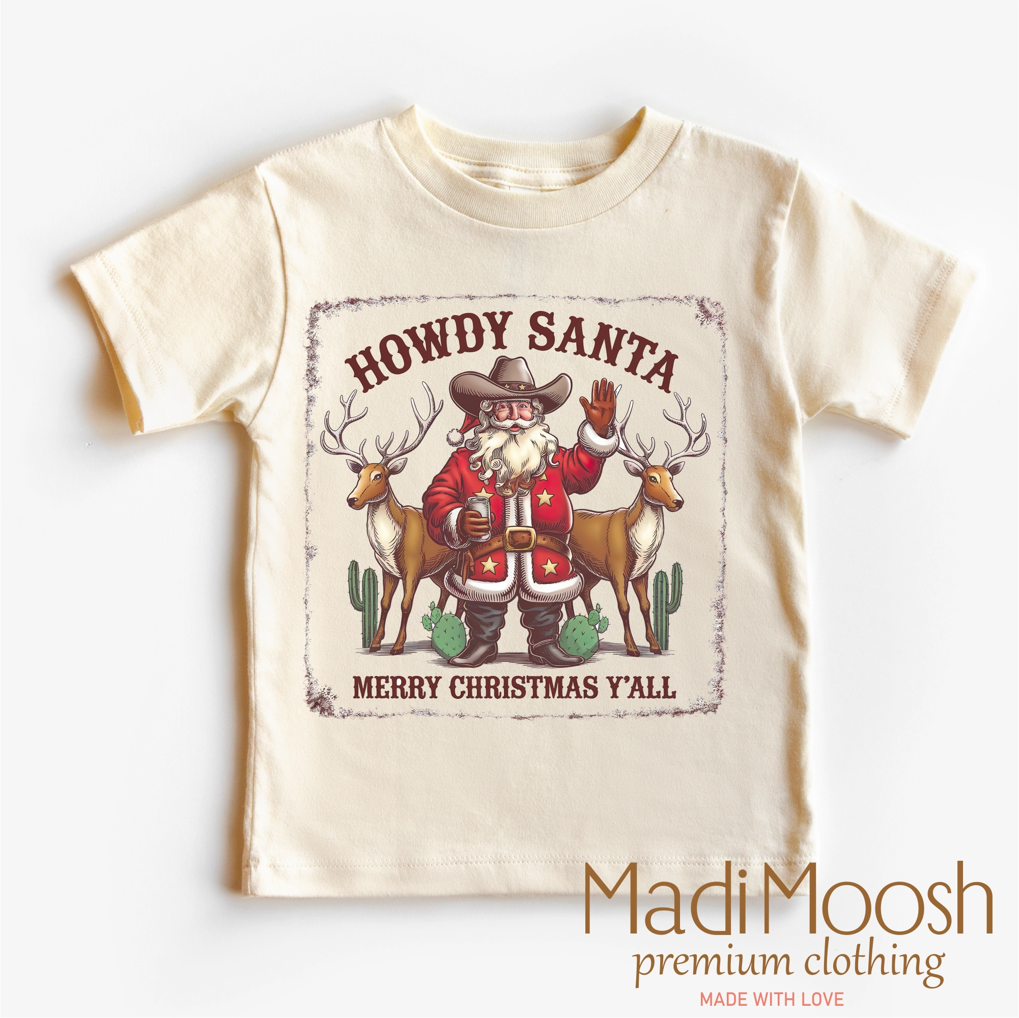 Saddle up for holiday fun with this charming Howdy Santa Kids T-shirt! Perfect for little ones who love the festive spirit, this tee combines Western flair with Christmas cheer. Featuring a playful design celebrating Santa and his reindeer, it's an ideal choice for holiday gatherings, family photos, or casual seasonal wear. Comfortable and eye-catching, this shirt lets kids show off their holiday spirit with personality and style. Make this season memorable with a tee that brings smiles and spreads joy wherever they go.