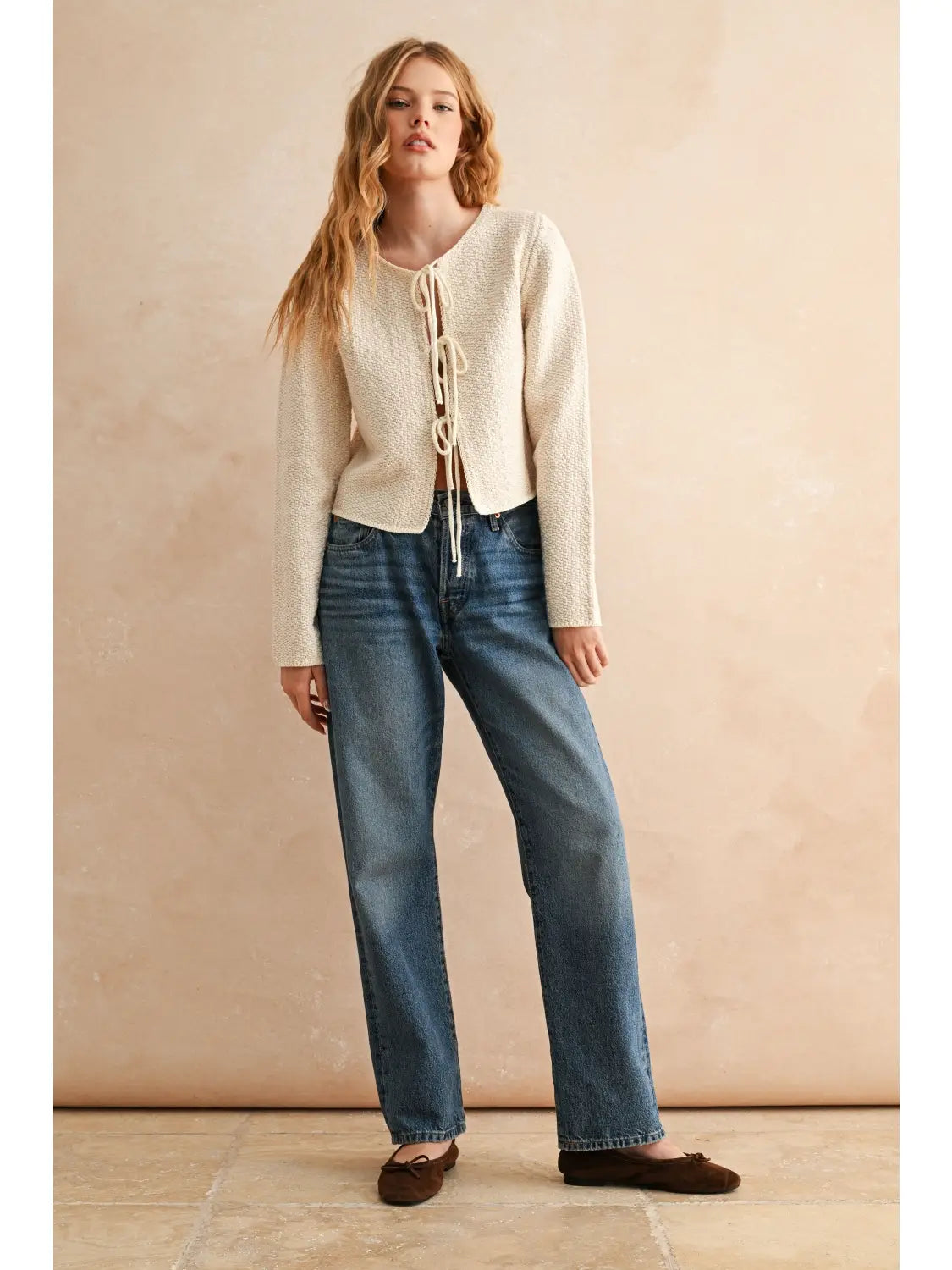 Elevate your everyday wardrobe with this versatile Front Tie Cardigan, a timeless piece that effortlessly transitions from season to season. Crafted in a soft cream hue, this long-sleeve essential features a charming tie-front closure that allows you to customize your fit and create flattering silhouettes for any occasion. Whether layered over a dress for added warmth or worn open as a lightweight topper, this cardigan delivers both comfort and style. The relaxed yet polished design makes it perfect for casual outings, office settings, or cozy weekends at home. Invest in a piece that works as hard as you do.