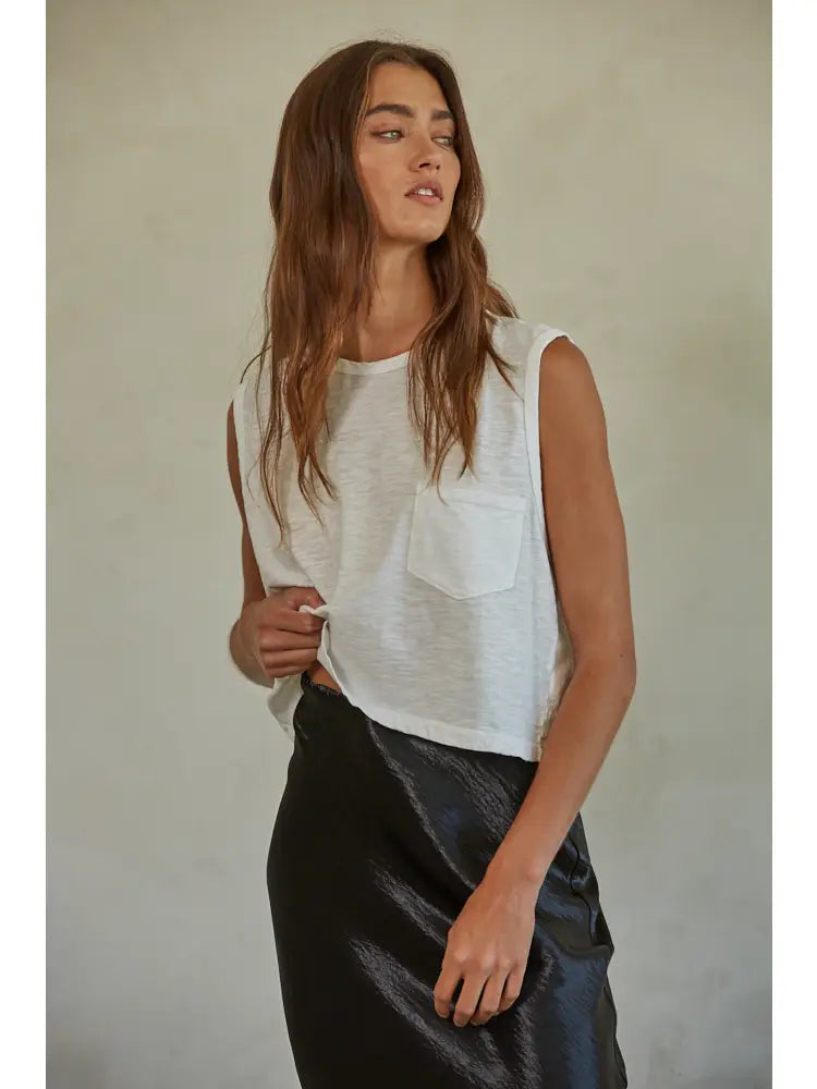 Elevate your summer wardrobe with our Shy of a Deck Tee! Made from comfortable knit cotton jersey that's garment washed for ultimate softness. The sleeveless design, crew neck, and front pocket add stylish and practical details. Perfect for any casual outing, this crop top will have you looking and feeling your best.