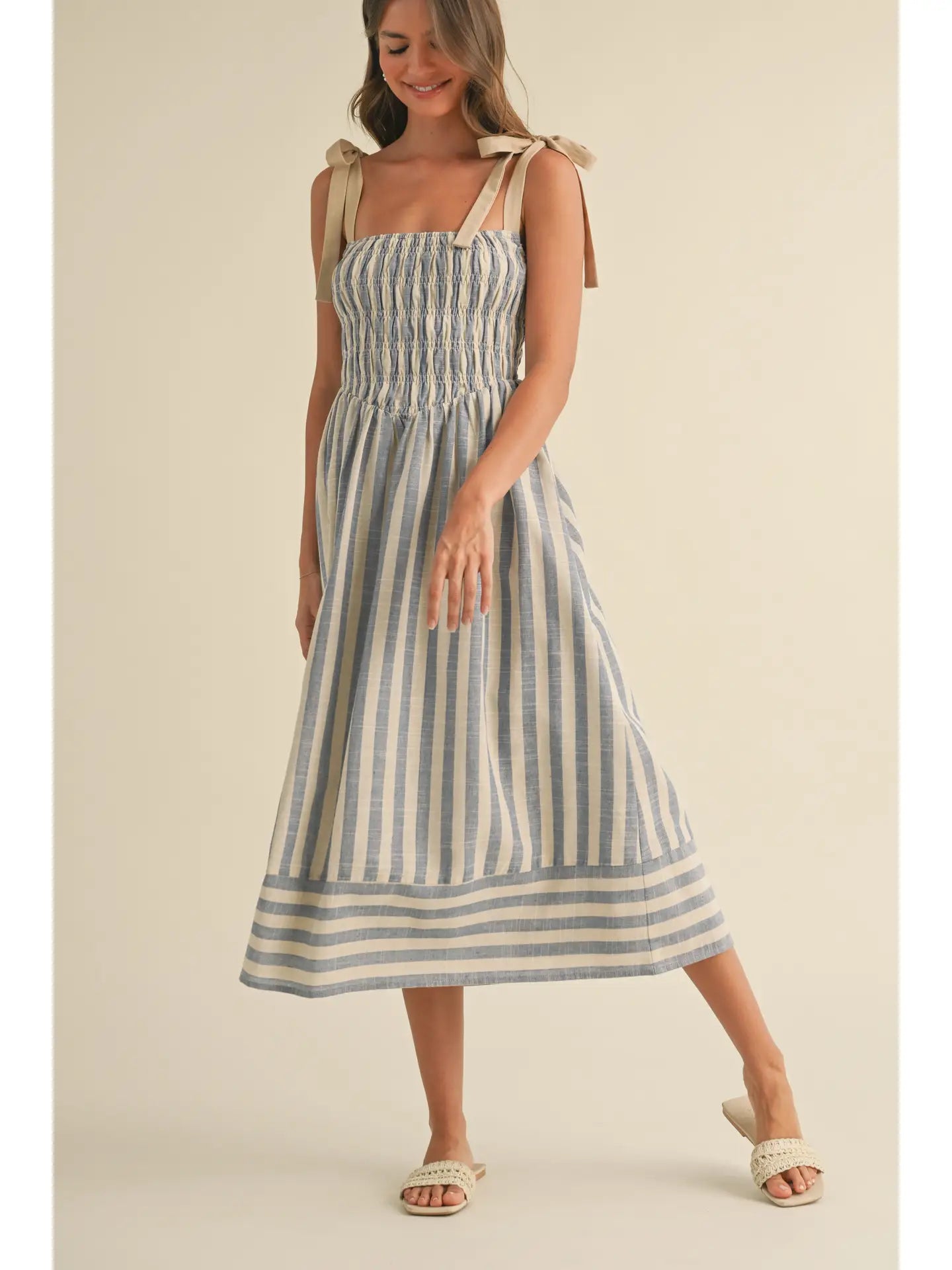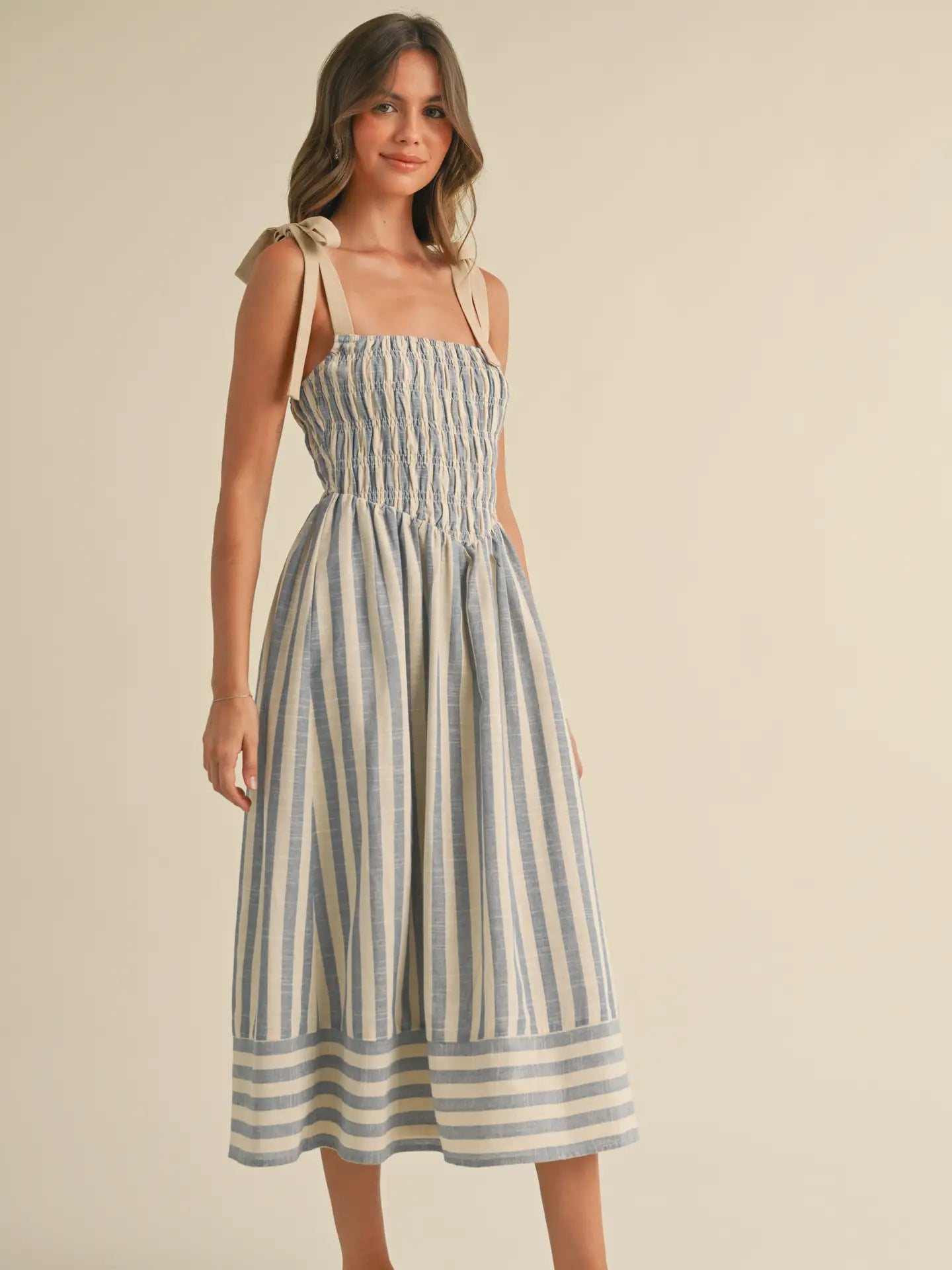 The Chloe Striped Midi Dress features a flattering smocked top that ensures a comfortable, flexible fit. Its tiered skirt adds playful volume and movement, perfect for any occasion. Adjustable tie shoulder straps offer a customizable fit and a charming, feminine touch. This dress effortlessly combines style and comfort for your wardrobe.
