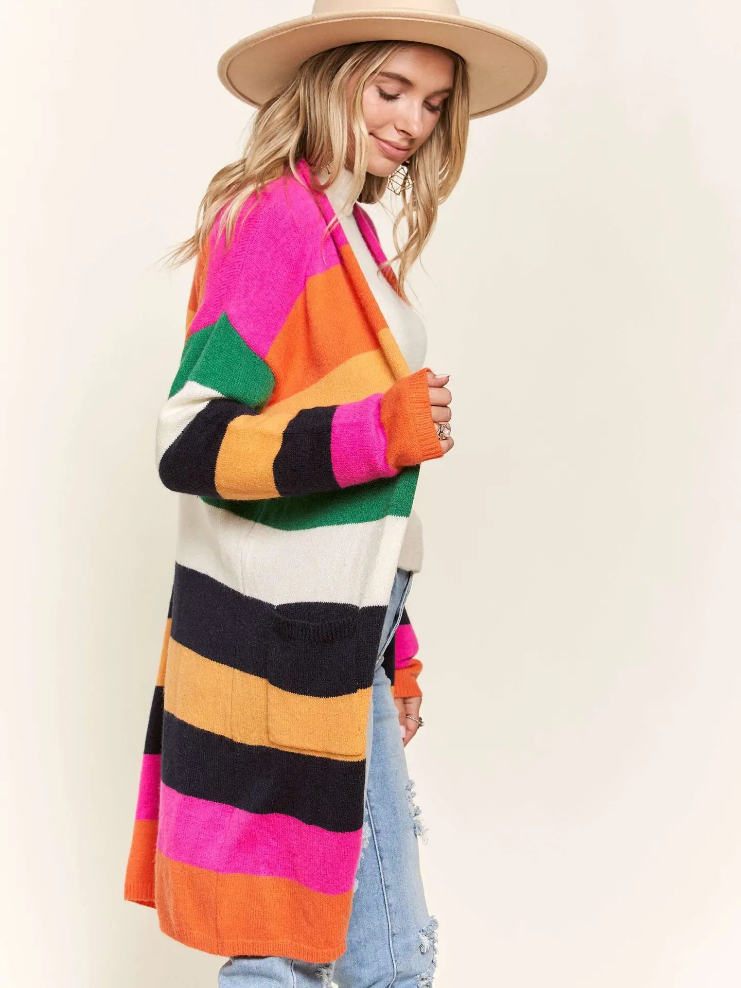 Experience the perfect balance of style and comfort with our Kara Striped Cardigan. Made from soft and lightweight material, this long cardigan features colorful stripes that will add a pop of color to any outfit. Stay warm and trendy while making a statement!